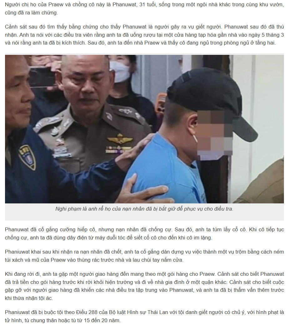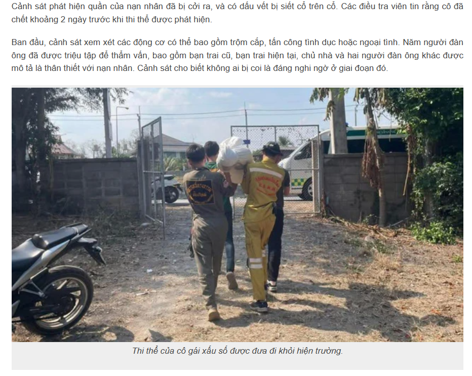 Thông tin được đăng tải trên tờ The Thaiger cho biết, vụ việc mới xảy ra cách đây vài ngày tại một ngôi nhà thuê ở Chiang Mai. Theo đó, nạn nhân, một nữ phục vụ bàn 22 tuổi, tên là U-sa, hay còn gọi là Praew, đã không đến chỗ làm.