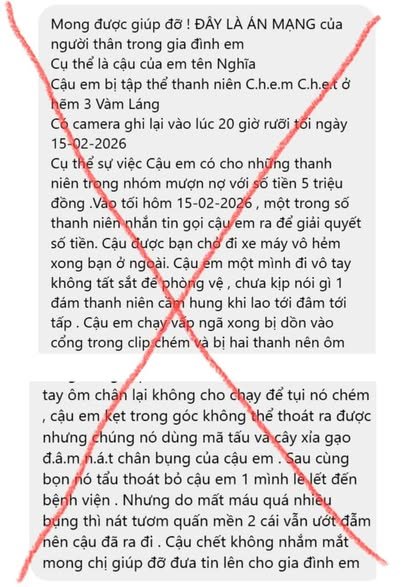 Tối ngày 15-02-2026, một người trong nhóm này nhắn tin gọi Nghĩa ra gặp để giải quyết khoản tiền. Nạn nhân được bạn chở bằng xe máy đến đầu hẻm, sau đó đi bộ một mình vào bên trong. Khi chưa kịp trao đổi, một nhóm thanh niên mang theo hung khí được cho là đã lao tới tấn công.