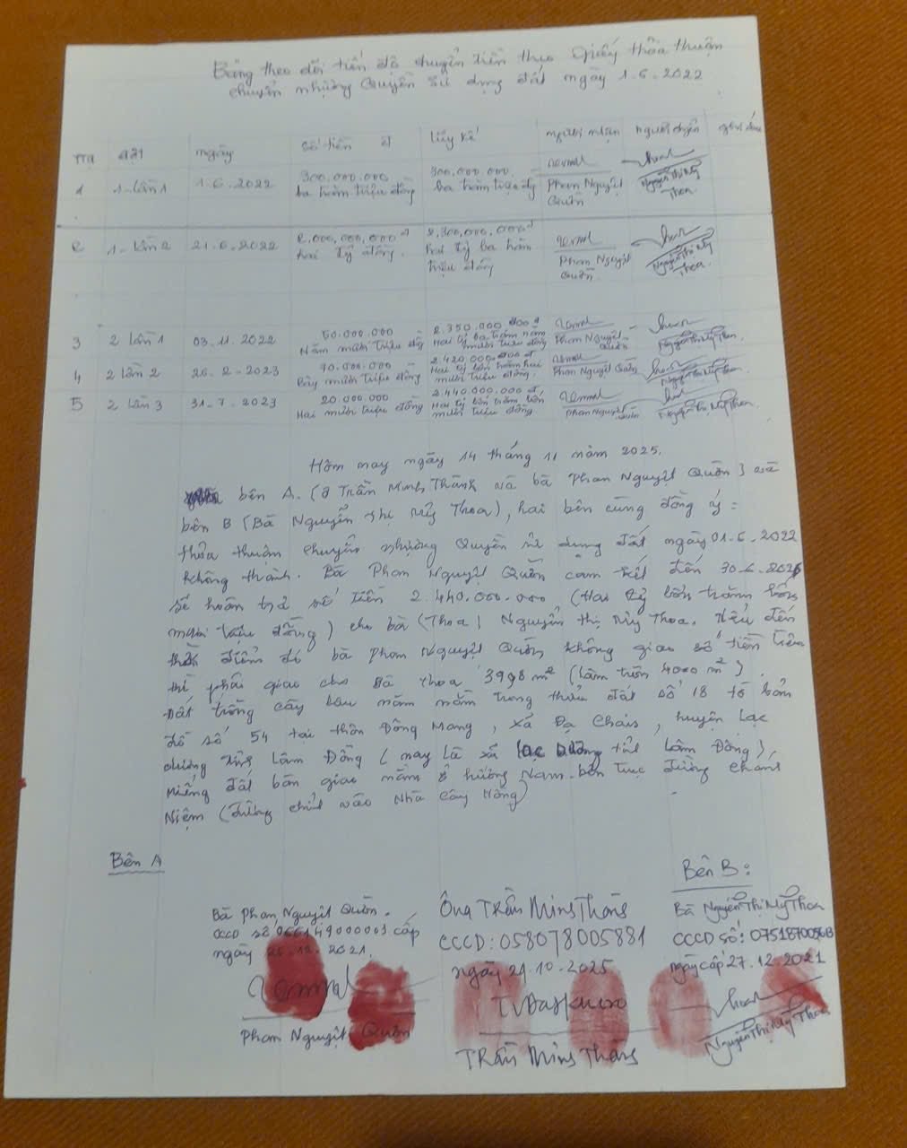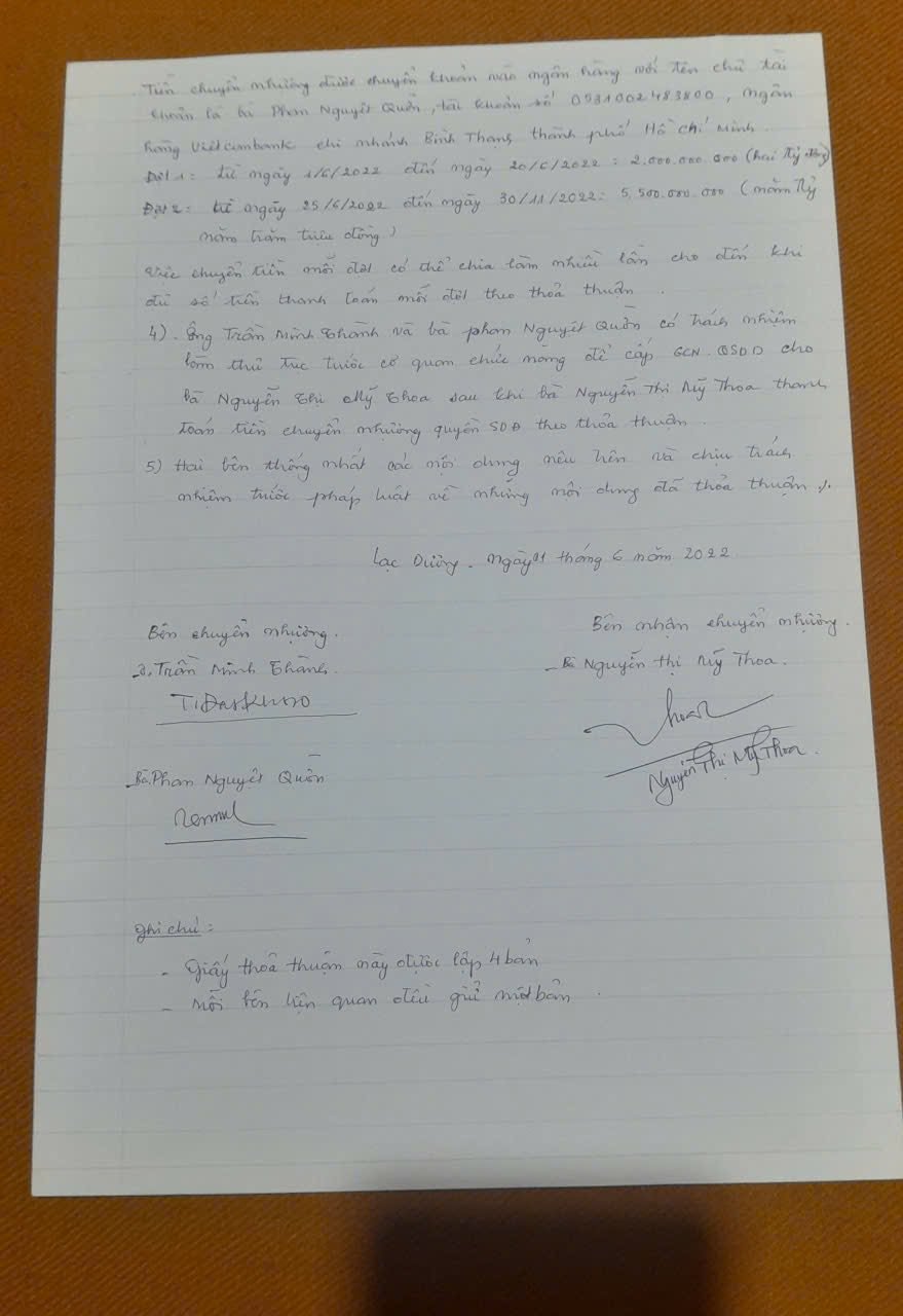 8. Ngày 1/6/2022 bạn Thoa đồng ý lập thoả thuận chuyển nhượng khu đất của cô Phan Nguyệt Quờn tại xã Đa Chais, huyện Lạc Dương, tỉnh Lâm Đồng (cũ). Diện tích chuyển nhượng: 12.000 m2. Giá chuyển nhượng: 7,5 tỷ đồng. Phương thức thanh toán: Làm 2 đợt theo tiến độ thoả thuận. Đợt 1: Từ 1/6/2022 đến 20/6/2022 số tiền 2 tỷ đồng. Đợt 2: Từ 25/6/2022 đến 30/11/2022 số tiền 5,5 tỷ đồng. Việc chuyển tiền có thể chia nhiều lần. Đến ngày 31/7/2023 bạn Thoa chỉ mới chuyển được: 2,44 tỷ đồng.